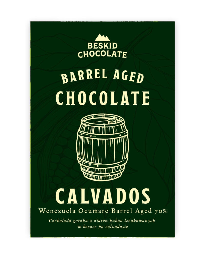 Czekolada gorzka 70% kakao z ziaren Wenezuela Ocumare, dojrzewających w beczce po calvadosie. Leżakowanie nibsów w dębowej beczce po francuskim destylacie nadaje tabliczce delikatny, owocowo-beczkowy akcent, subtelnie podkreślający charakter kakao.
