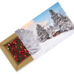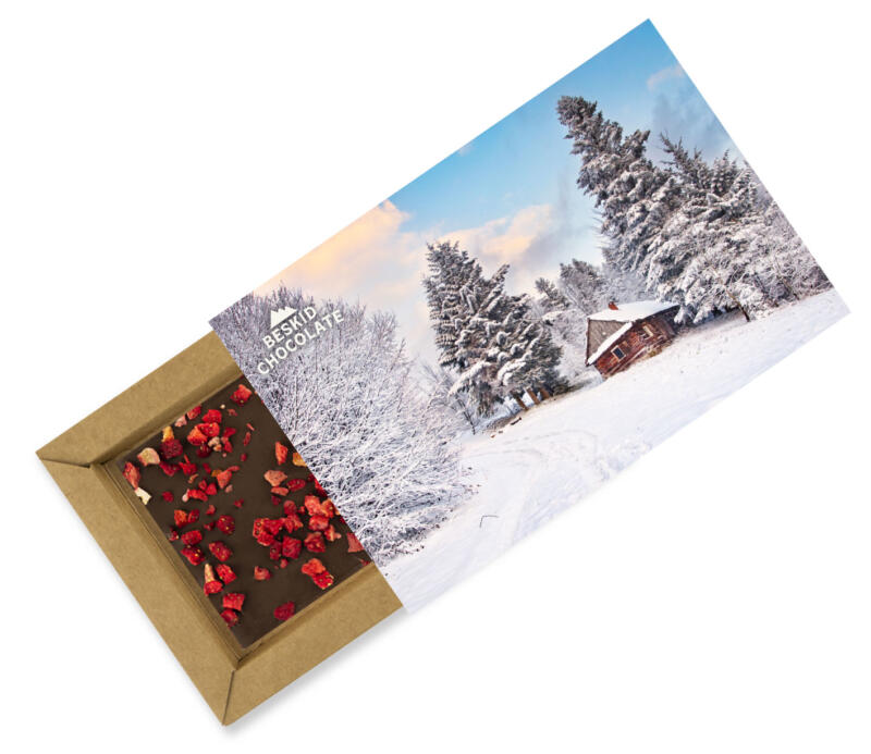 Czekolada mleczna z liofilizowanymi truskawkami.