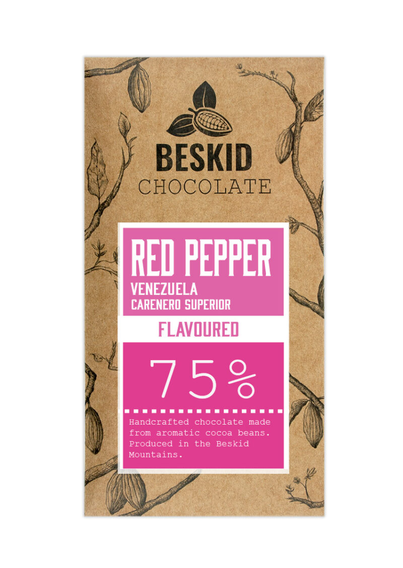 Czekolada rzemieślnicza produkowana od ziarna do tabliczki (bean to bar) z ziarna z Wenezueli (z regionu Caranero) wysokiej jakości aromatycznych odmian ziarna kakaowca i cukru trzcinowego nierafinowanego z czerwonym pieprzem. Konszowana min. 48 godzin.