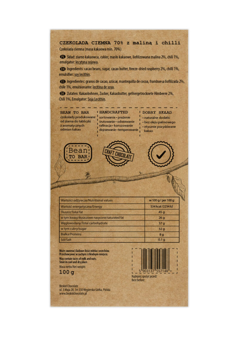 Czekolada ciemna produkowana przez Beskid Chocolate z mieszanki wysokiej jakości ziaren kakaowca (70%) i cukru trzcinowego z dodatkiem lecytyny sojowej.