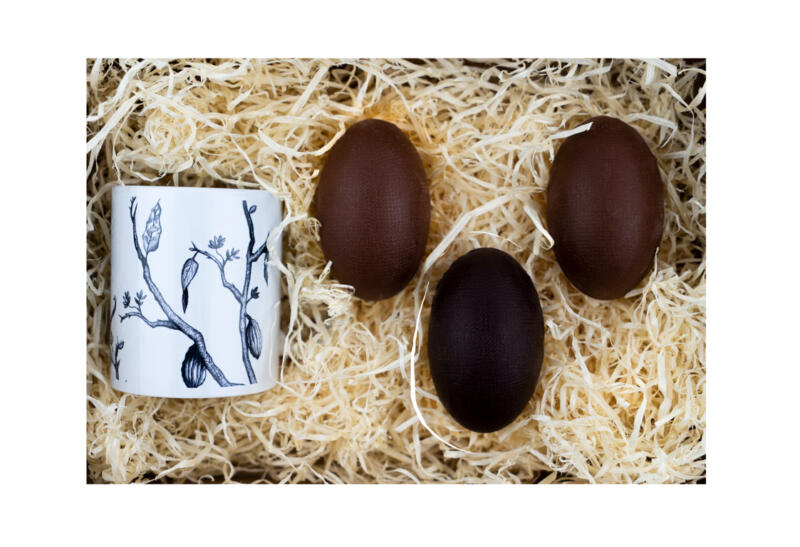 Zestaw 3 czekoladowych jaj z dodatkami oraz ceramiczny kubek zapakowany jest w pudełko typu kraft z tektury falistej. Pudełko podkreśla rzemieślniczy charakter naszych produktów. Pudełko wypełnione jest eko – wiórkami, które dodatkowo ozdabiają produkt, ale też zabezpieczają je na czas transportu. Pudełko prezentowe zawinięte jest opaską dekoracyjną z nadrukiem Beskid Chocolate. Rozmiar pudełka 25 cm x 18 cm x 8 cm