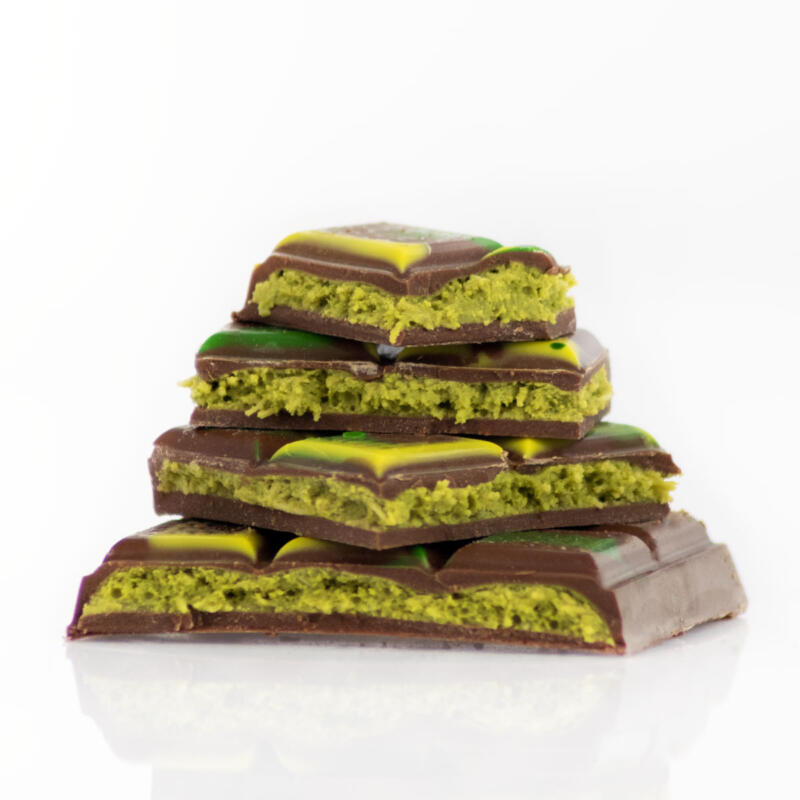 Korpus czekolady wykonany jest z mlecznej kraftowej czekolady od ziarna do tabliczki o 50% zawartości kakao. Nadzienie (ganache) w środku to 60% najwyższej jakości zielonej pistacji, delikatnie prażonej aby zachować naturalny kolor i smak z dodatkiem rzemieślniczej białej czekolady, sezamowej pasty tahini oraz delikatnego, chrupiącego ciasta kadaifi.