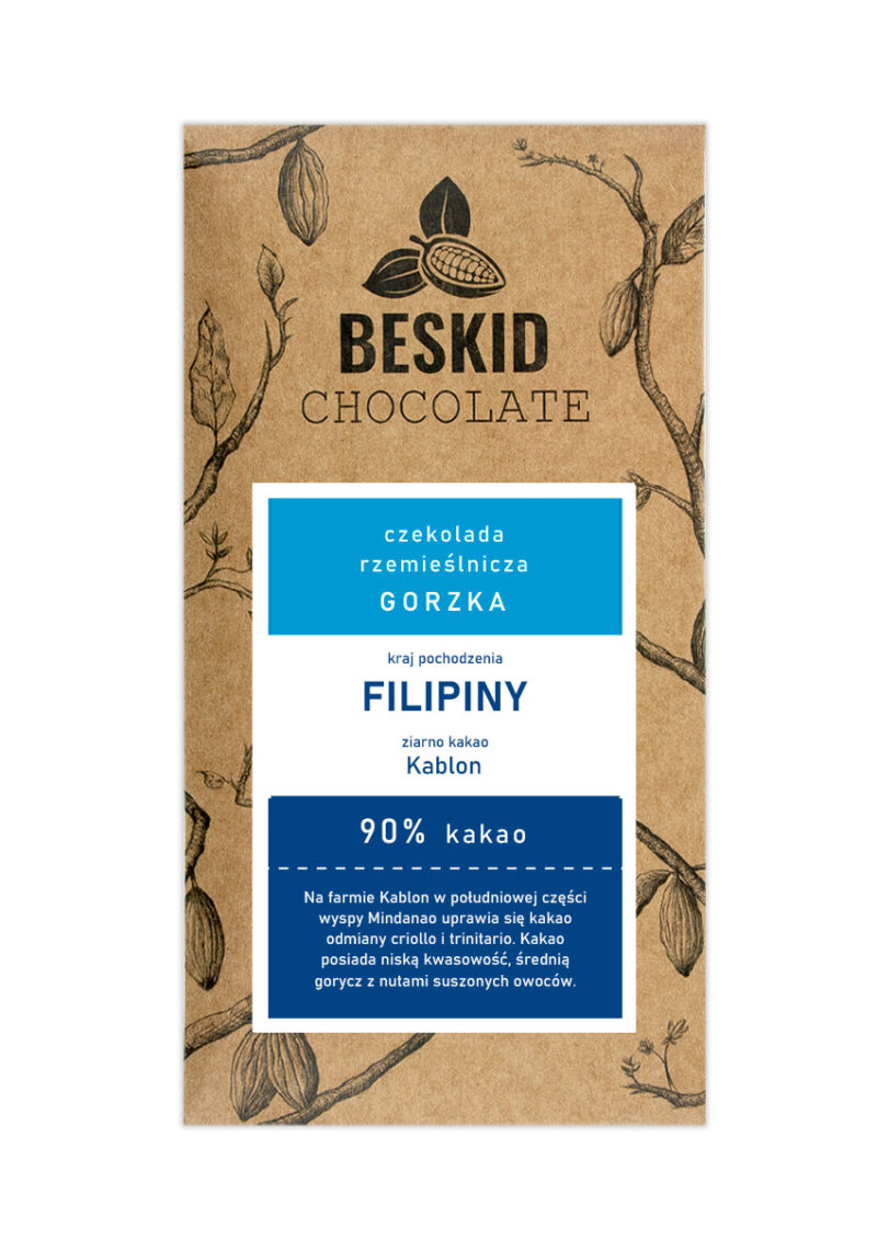 Czekolada rzemieślnicza produkowana od ziarna do tabliczki (bean to bar) z wysokiej jakości aromatycznych odmian ziaren kakaowca pochodzących z Filipin farma Kablon i cukru trzcinowego nierafinowanego.