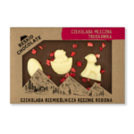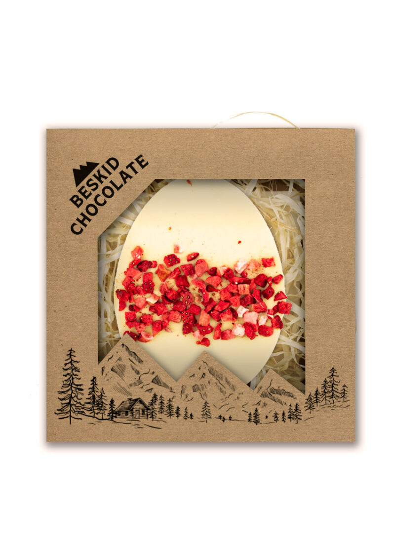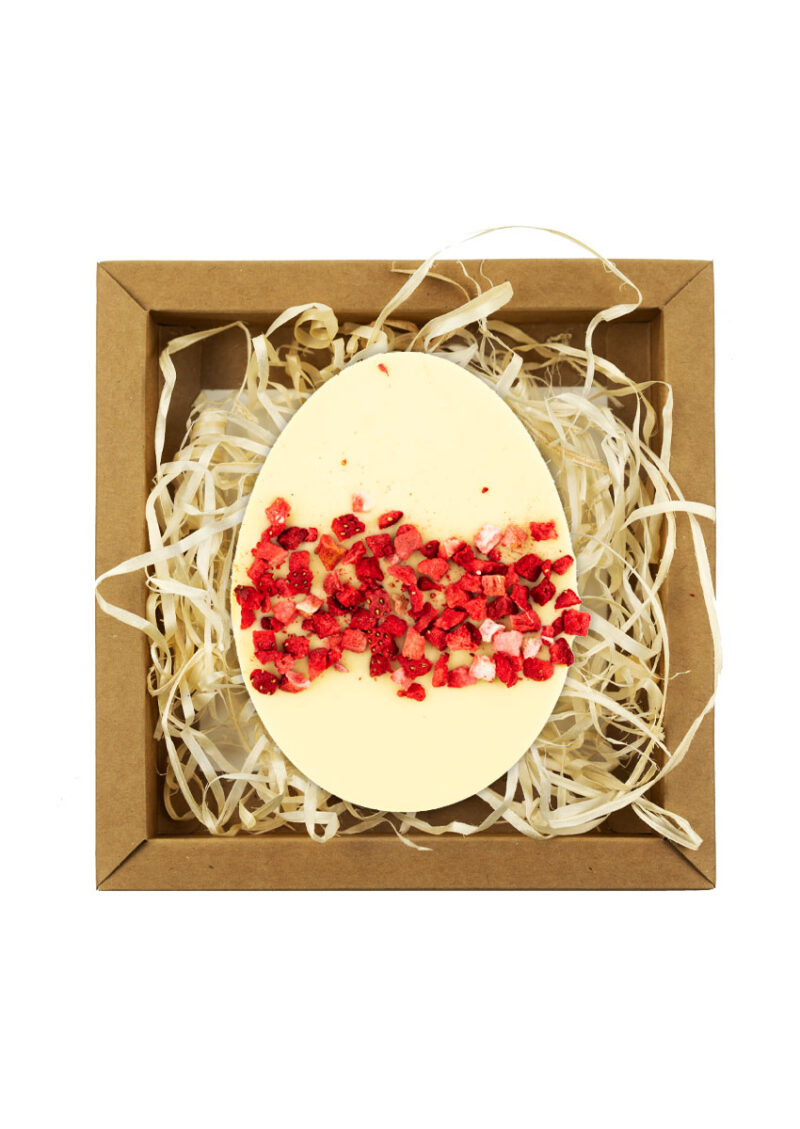 Jajko z czekolady białej z dodatkiem truskawek. Pakowane w estetyczne pudełko z kartonu kraft wypełnione „eko wiórkami”.