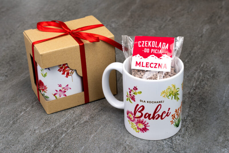 Prezent DLA BABCI kubek i czekolada do picia zapakowany w pudełko przewiązane wstążką. Doskonały prezent od wnuków dla kochanej babci!