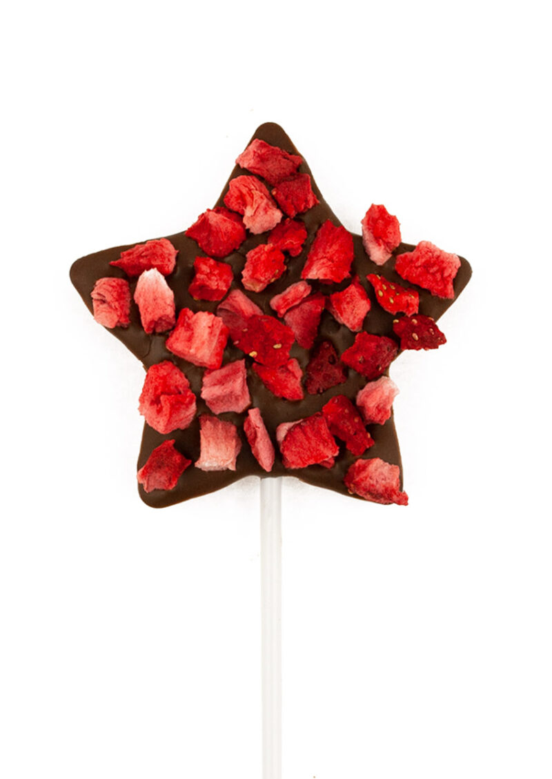 Lizak w kształcie świątecznej gwiazdki z czekolady mlecznej z truskawkami