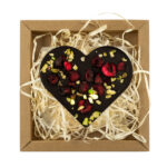 Serce z czekolady białej z dodatkiem truskawek liofilizowanych. Pakowane w estetyczne pudełko z kartonu kraft wypełnione „eko wiórkami”.