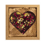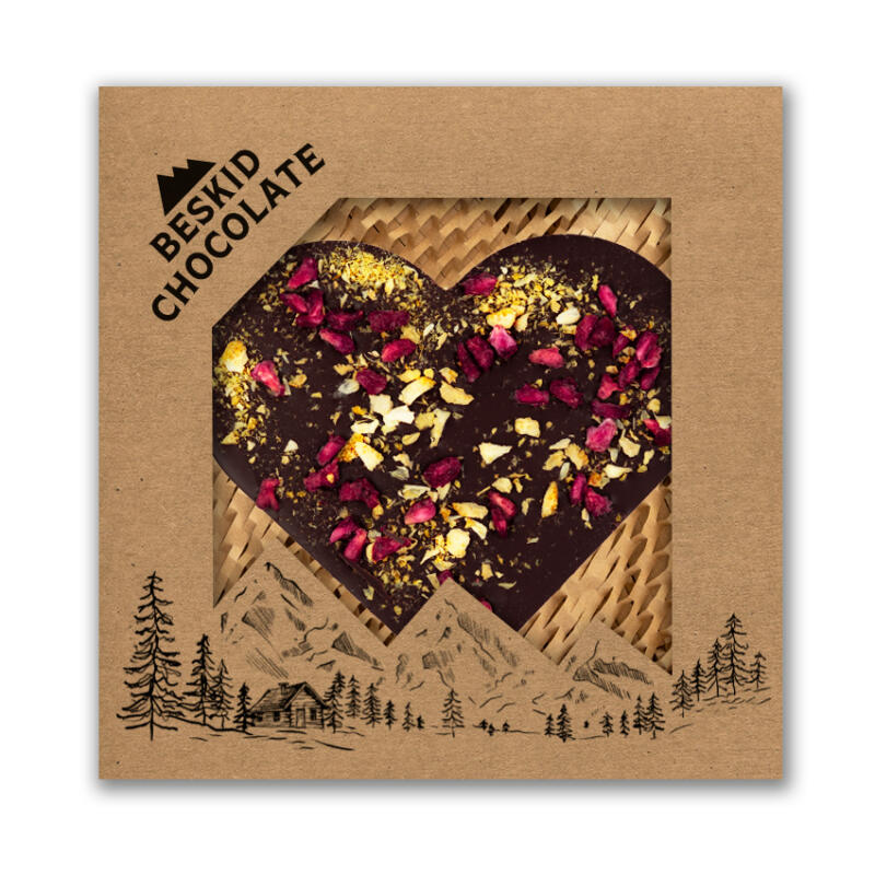 Serce z czekolady ciemnej 72 % z dodatkiem truskawek. Czekoladowe serce zapakowane jest w estetyczne pudełko z kartonu typu kraft wypełnione „eko wiórkami”.