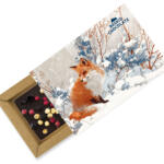Zapakowane jest w pudełko z kartonu kraft o rozmiarze 18 cm x 18,5 cm x 2,5cm wypełnione eko-wiórkami.