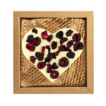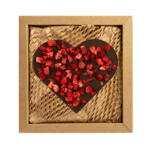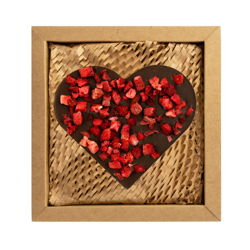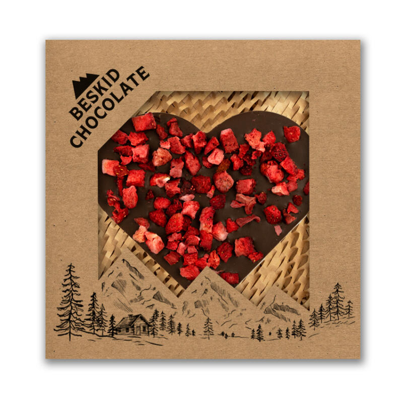 Serce z czekolady mlecznej z dodatkiem truskawek liofilizowanych. Pakowane w estetyczne pudełko z kartonu kraft wypełnione „eko wiórkami”.