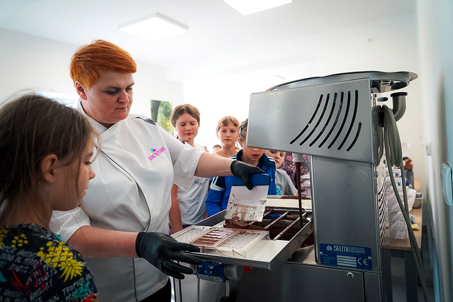 Podczas wizyty w naszej małej słodkiej fabryce, można zobaczyć, jak czekolada jest produkowana od początku do końca, począwszy od surowych ziaren kakaowych, aż do gotowego produktu. Zwiedzający mogą zobaczyć, jak kakaowe ziarna są prażone, mielone, mieszane z cukrem i innymi składnikami, a następnie formowane w kształty, które znamy z półek sklepowych. Wszystkie etapy produkcji odbywają się w ścisłej kontroli jakości, aby zapewnić, że każda tabliczka czekolady będzie idealna w smaku.