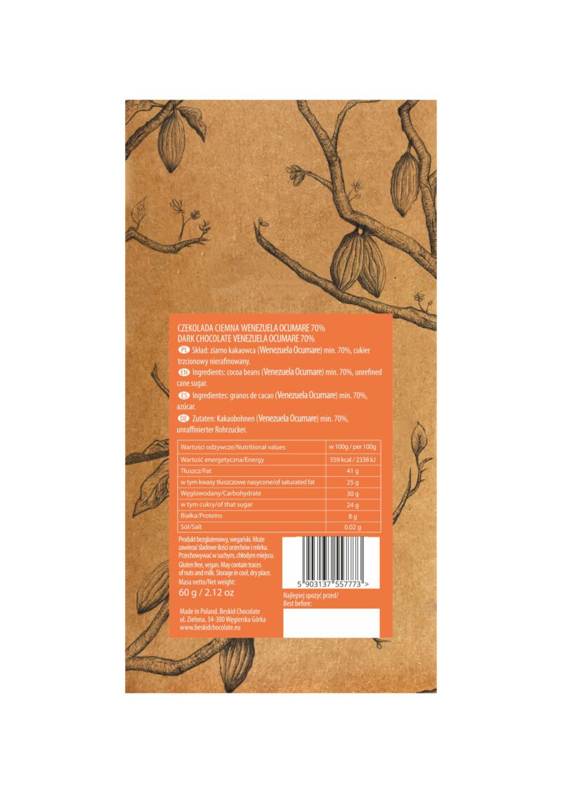 Czekolada ciemna 70% Wenezuela ziarna odmiany Caicara del Orinoco pochodzące z gospodarstwa Valdiviezo.