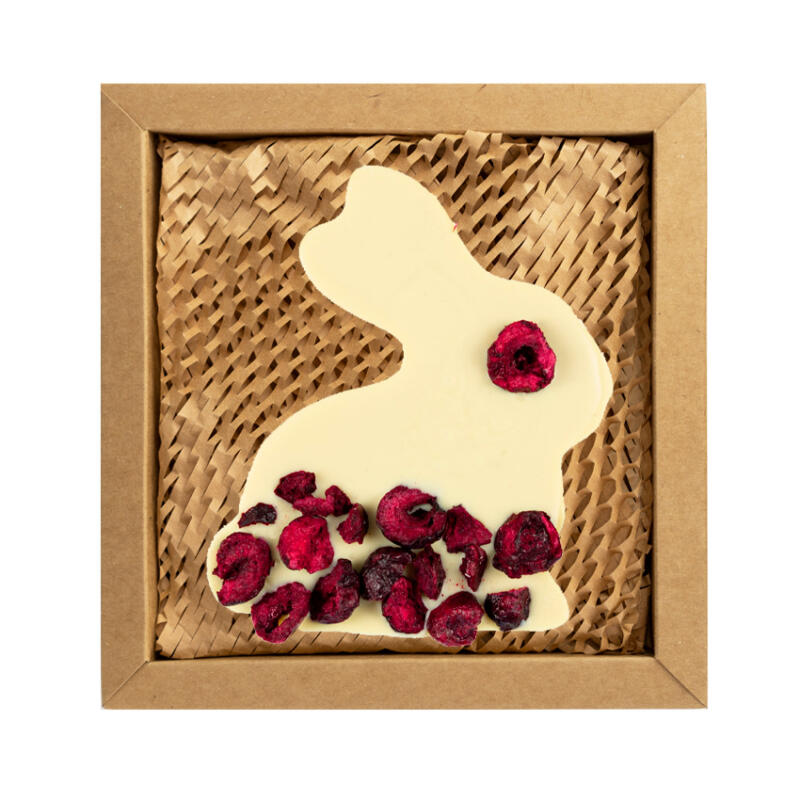 Elegancki wielkanocny zajączek z białej czekolady 32% masła kakaowego, wzbogacony liofilizowanymi truskawkami. Aksamitna, kremowa czekolada doskonale łączy się z owocową nutą. Zapakowany w kraftowe pudełko – idealny na wielkanocny prezent.