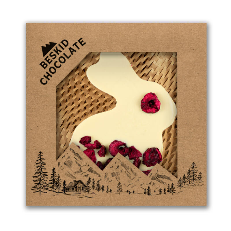 Duży wielkanocny zajączek wykonany z białej czekolady 32% masła kakaowego, o wyjątkowo kremowej konsystencji i delikatnej słodyczy. Dodatek liofilizowanych truskawek nadaje mu owocową świeżość i lekko kwaskowy akcent, idealnie balansujący aksamitność czekolady. Każdy egzemplarz zapakowany jest w kraftowe pudełko (18 cm x 18,5 cm x 2,5 cm), wypełnione dekoracyjnym papierem strukturalnym. To doskonały wybór na wielkanocny prezent dla miłośników ręcznie robionej czekolady.