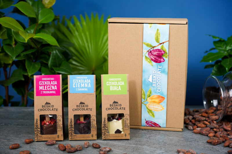 Zestaw podarunkowy czekolad na gorąco zapakowany jest w pudełko typu kraft z tektury falistej. Pudełko podkreśla rzemieślniczy charakter naszych produktów. Pudełko wypełnione jest eko – wiórkami, które dodatkowo ozdabiają produkt, ale też zabezpieczają je na czas transportu.
