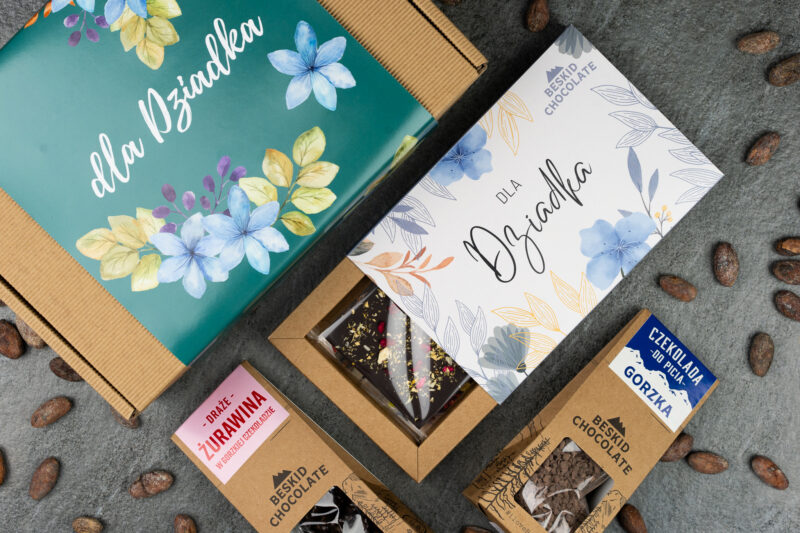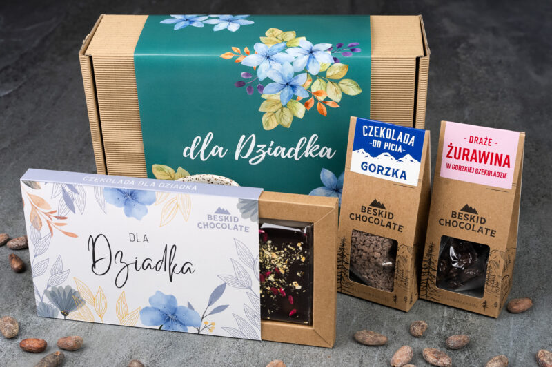 Prezent DLA DZIADKA czekolada i draże zapakowany w pudełko w ozdobnej opasce z napisem „Dla Dziadka”. Pudełko podkreśla rzemieślniczy charakter naszych produktów. Pudełko wypełnione jest eko – wiórkami, które dodatkowo ozdabiają produkt, ale też zabezpieczają je na czas transportu. Doskonały prezent od wnuków dla kochanego dziadka!