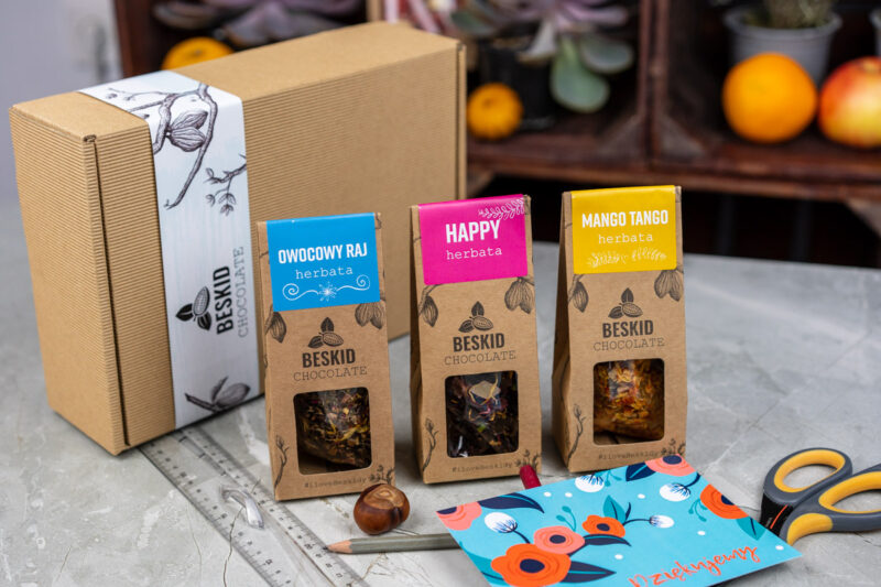 Proponowany zestaw prezentowy zapakowany jest w pudełko typu kraft z tektury falistej. Pudełko podkreśla rzemieślniczy charakter naszych produktów.  Pudełko wypełnione jest eko – wiórkami, które dodatkowo ozdabiają produkt, ale też zabezpieczają je na czas transportu.